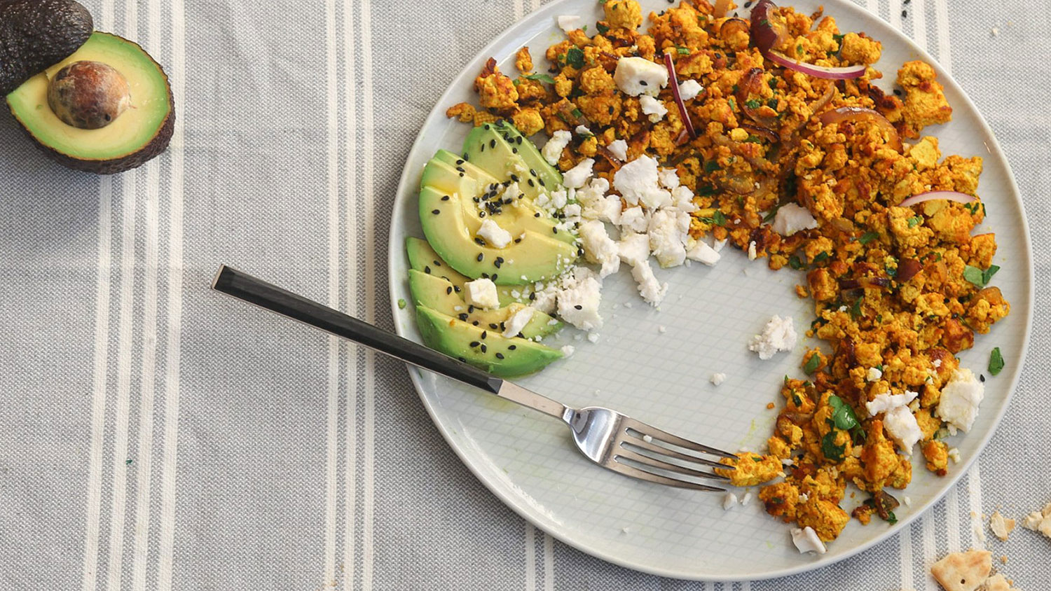 Svježi tofu dobro razmrvite rukama ili vilicom. Dodajte mu sve suhe začine i dobro promiješajte. U tavici zagrijte malo maslinovog ulja. Dodajte mu narezani luk i pržite minutu-dvije. Dodajte razmrvljeni tofu i ravnomjerno ga rasporedite po tavici pa umiješajte malo biljnog mlijeka. Pržite na umjerenoj vatri 8-10 minuta, povremeno miješajući. Pri kraju po želji dodajte malo sjeckanog peršina.